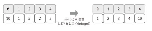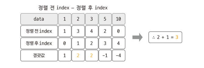 정렬전 수의 인덱스를 저장하고, 정렬 후의 인덱스와 비교한뒤