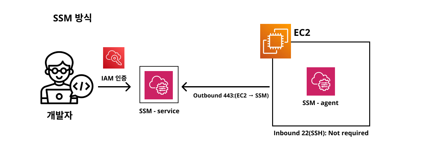 접속 흐름은 "외부(개발자)에서 서버로 직접 진입"이 아니라, "AWS 서비스와의 통신을 통해 서버에 명령을 전달"하는 형태로 바뀝니다.