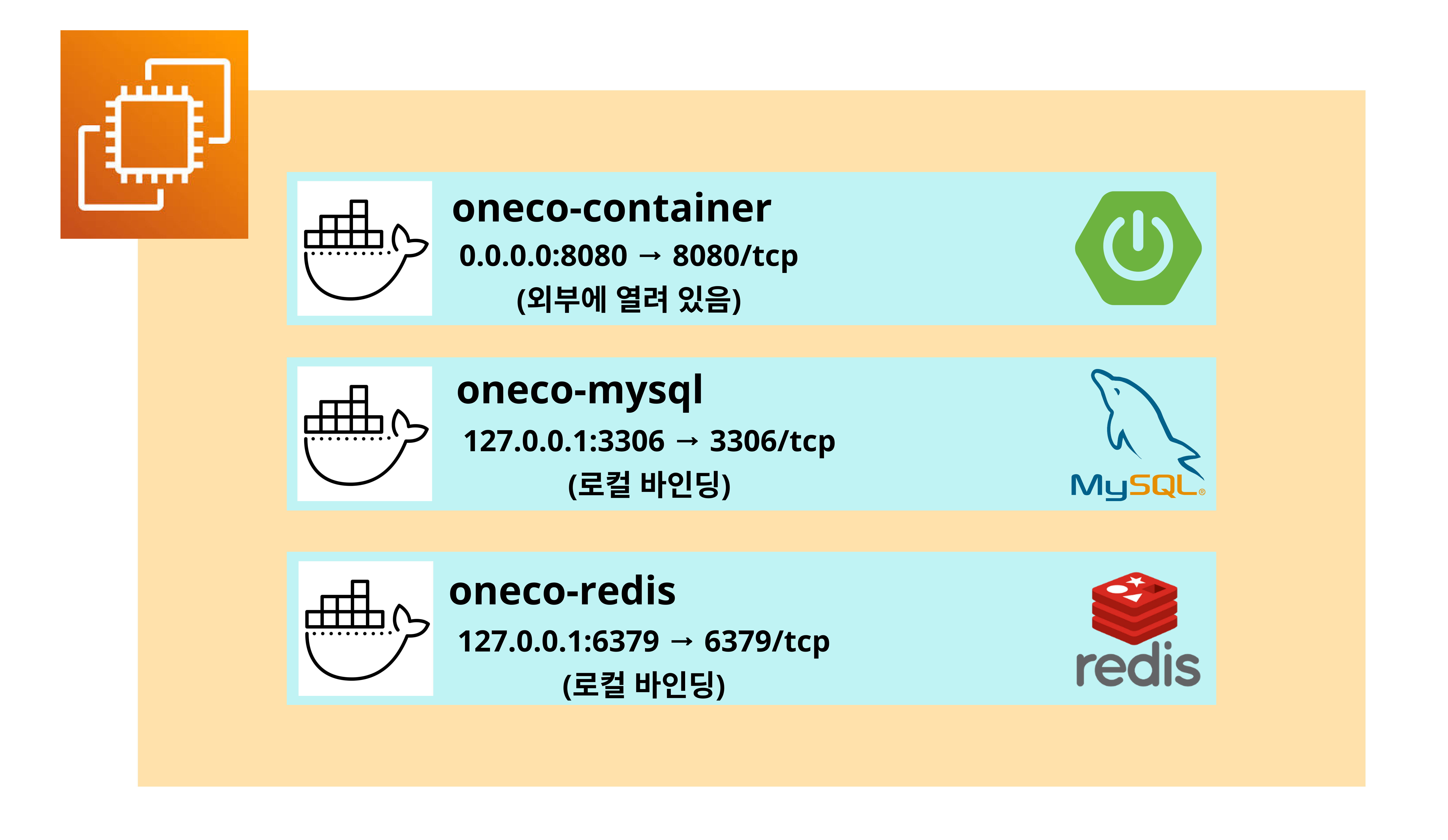 EC2 인스턴스 안에서 Spring 서버 / MySQL / Redis를 각각 독립 컨테이너로 띄워 운영했습니다.
