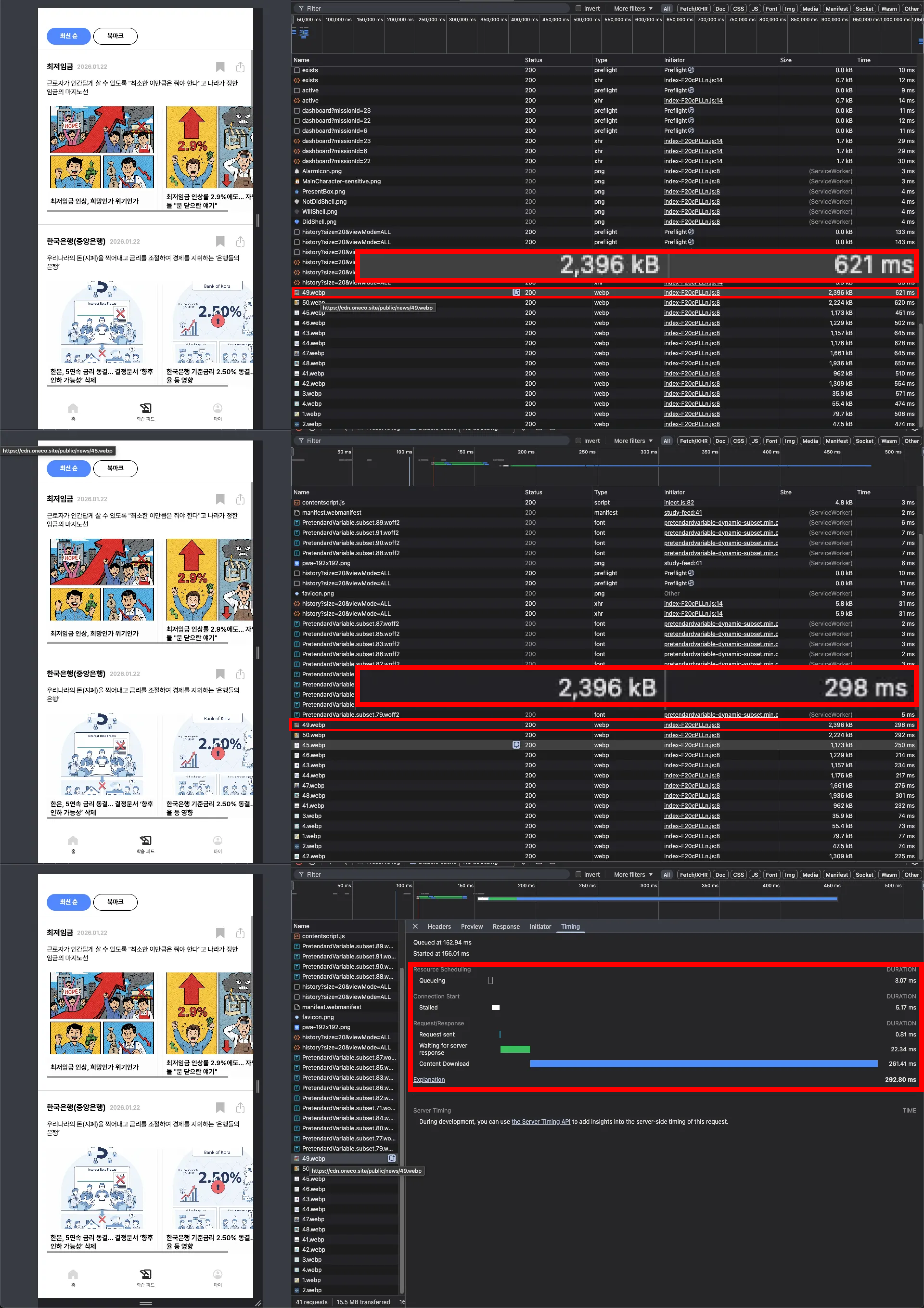측정은 Chrome DevTools → Network에서 이미지 요청의 Duration과 Timing(Content Download)을 기준으로 했습니다.