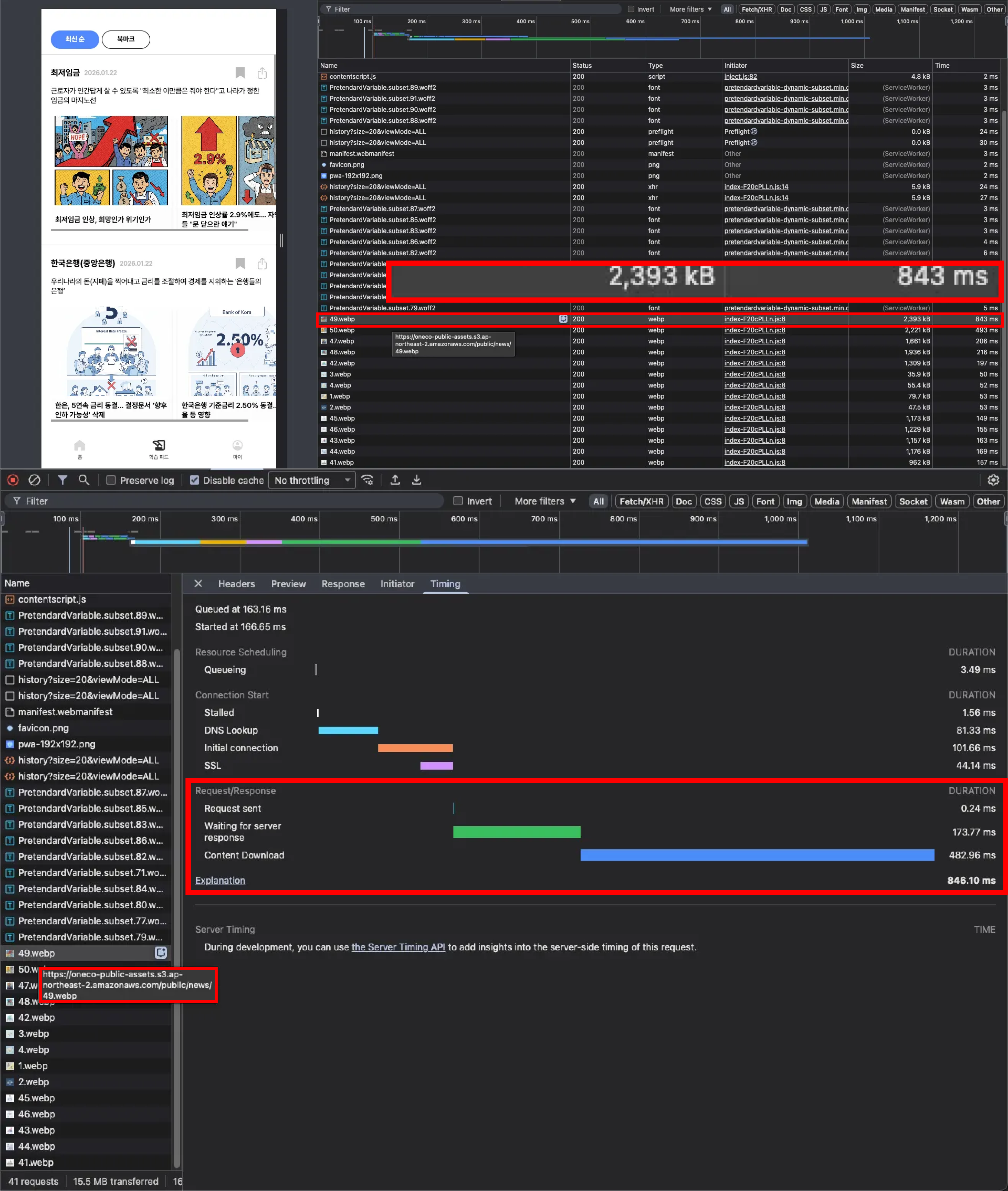 그런데도 브라우저에서는 유독 Content Download 구간이 길어져서, 이미지 렌더링이 10초 이상 걸리는 현상이 발생했습니다.