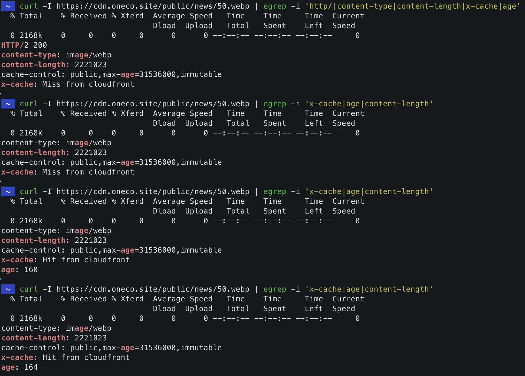 X-Cache: Miss from cloudfront → 반복 요청 시 Hit from cloudfront로 바뀌는 것도 정상적으로 확인했습니다.