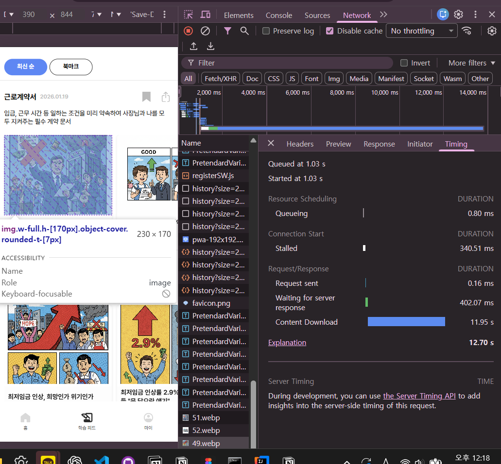 즉, 브라우저에서 발생한 12초는 "서버 응답이 늦어서"가 아니라, 개발자 도구(Network) 기준으로 Content Download(다운로드 구간)이 비정상적으로 길어지는 문제였습니다.